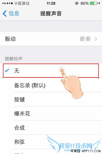 第四步,点击进入“提醒声音”选项页面,选择“无”,即可设置为“静音”模式。