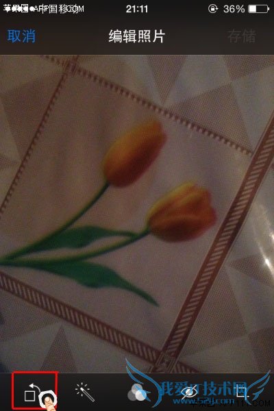 第三步,接着,照片下方会出现导航栏,在导航栏中点击最左边的旋转按钮(点击一下,即可将照片旋转90度),直到照片旋转至需要的样式。