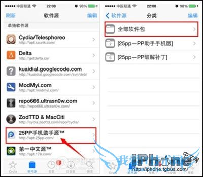 3、添加完毕后在软件源中找到“25PP手机助手源”,选择【全部软件包】;