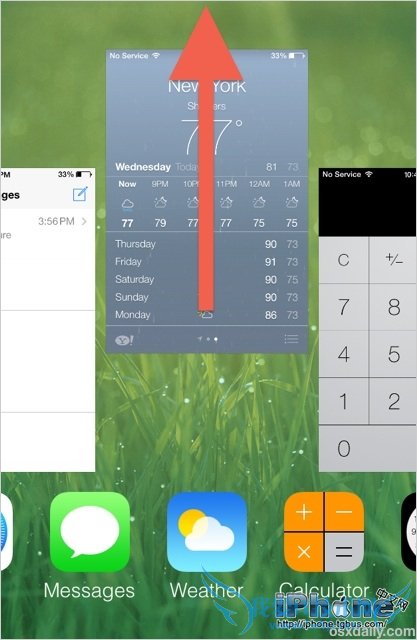 在iOS7中,同样召出多任务栏,然后通过向上滑动的方式来关闭程序