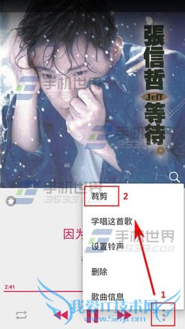1)首先我们先打开自带的【音乐播放器】,然后选一首你喜欢的歌开始播放,接着点击右下角的【三点】,然后点击【裁剪】,歌曲播放过程中,红色线条为播放进度,可在任意时刻点击标签按钮(5)做好记号,标签6、7分别为想要截取的开始和结束位置。(如下图)