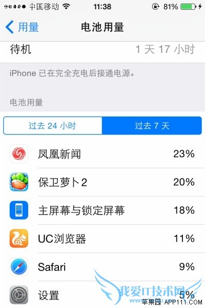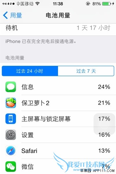 第三步,在电池用量页面,可以查看各应用的耗电情况,如可以查看过去24小时和过去7天应用耗电详情,耗电最多的应用可谓一目了然。