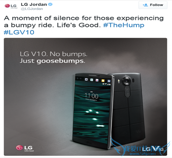而 LG 的 V10 配备了 1600 万像素 f/1.8 光圈的摄像头,并且支持 OIS 光学防抖,但是依然机身的背面设计得非常平坦。而 LG 发布了一张 V10 的海报,在海报上写了「没有崎岖,生活才更好」的口号。