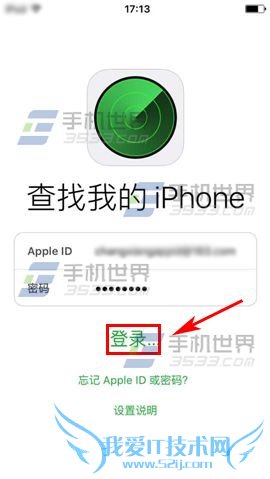 2)将【查找我的iPhone】右边滑块开启,输入Apple ID和密码后点击【登陆】。(如下图)