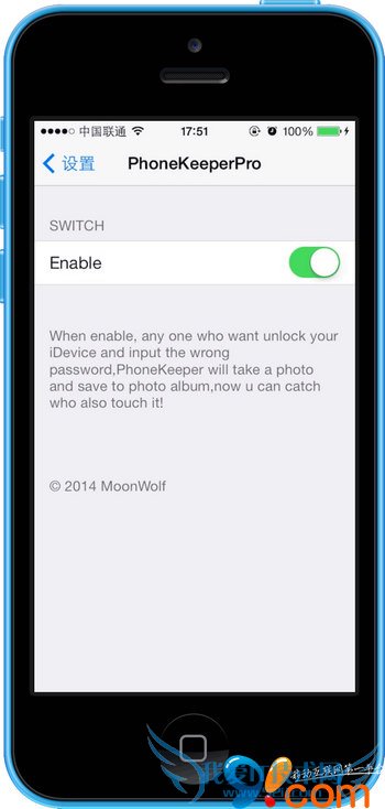 安装完成后,进入【设置】→【PhoneKeeperPro】中,打开开关【Enable】,然后返回到【设置】进入【通用】→【密码锁定】→【打开密码】,给你的设备设置一个锁屏密码。接着无论是谁输错了密码,PhoneKeeperPro都会无声无息地开启前置摄像头拍下Ta的样子,并保存在你的照片库里面。