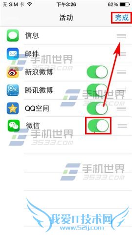 2)把【微信】右边的按钮开启,点击【完成】,返回上一步点击【微信】图标即可分享。(如下图)