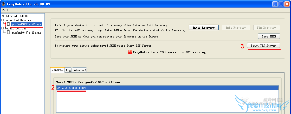 3)Start TSS Server前,是否选中了你的iPhone(注意是Connected Devices,而非Recent Devices)以及你想要恢复的.shsh基带?