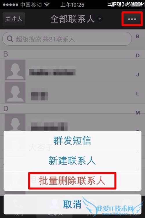 3、点击右上角的【…】选项框,在弹出的列表中选择“批量删除联系人”;