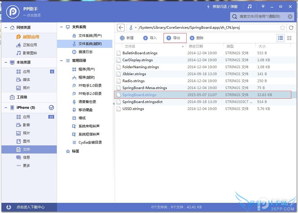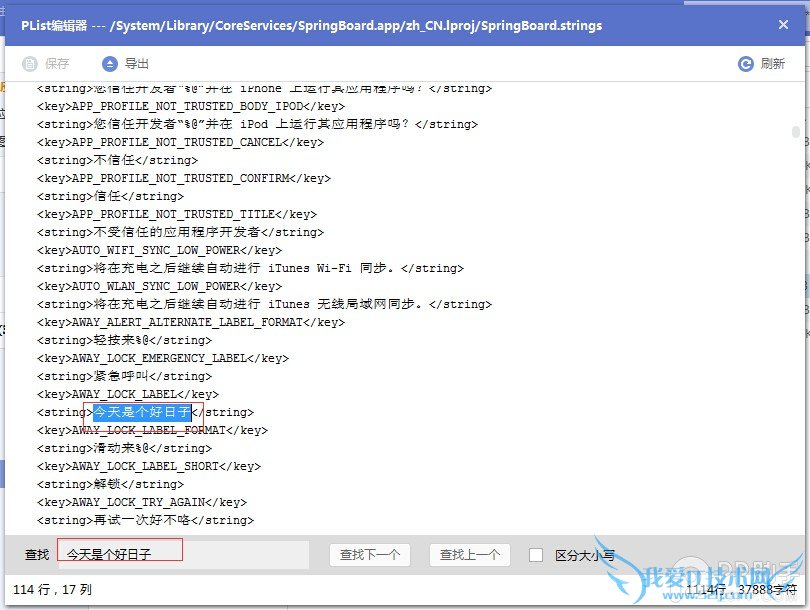 ④开文件系统(越狱)/System/Library/CoreServices/SpringBoard.app/zh_CN.lproj,找到spingboard.strings这个文件,“导出”备份下,然后双击打开,搜索“滑动来解锁”,找到后删除这几个字,然后关闭保存。