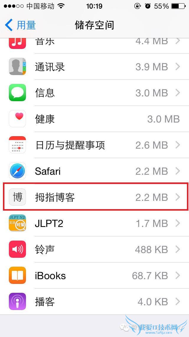第三步:除了查看每个 App 所占的空间之外,同时也可以查询各个 App 的详细资料。 这里以“拇指博客”为示范。