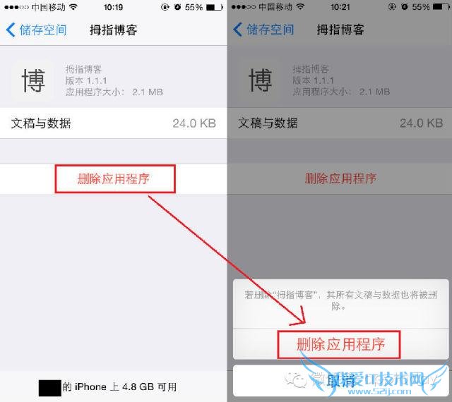 第四步:进入“拇指博客”后,会显示 App 的版本、容量、文件数据的大小。 如果这套 App 没必要留着,就可以点急“删除应用程序”,并确认“删除应用程序”。