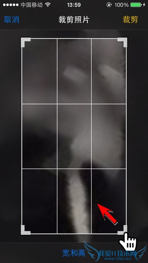 第5步:如图所示按住图片的一角上的直角框,向左上角拖动,将图片放大到看不清主体:
