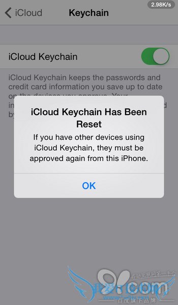 弹出「iCloud 钥匙串已被重设」通知面板。点击「好」按钮来返回设置。至此你的 iCloud 钥匙串的安全码和绑定的手机号码均已更新。