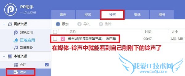 5、下载完毕会后,你可以在PP助手的“媒体”-“铃声”中找到自己添加的手机铃声。但要注意的是,如果你是来电铃声,那么它就只能作为来电铃声,如果是短信铃声,那么它就只能做短信铃声,不是说你下一一个铃声,来电和短信都可以用这个铃声。