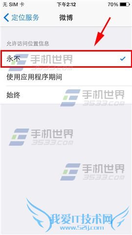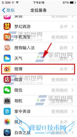 2)选择一个你需要关闭定位的软件,这里以【微博】为例,点击进入后选择【永不】即可。(如下图)