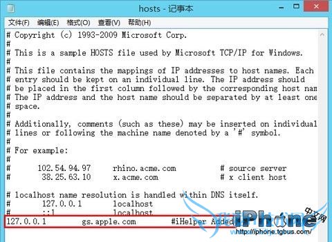 4.在hosts上右键选择用记事本或写字板打开,在底部找到“127.0.0.1 gs.apple.com #iHelper Added”字段并进行删除,而后保存修改退出编辑。