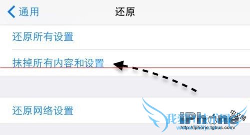 - 抹掉所有内容和设置 :这个选项的作用就是这里讲到的“重置”功能了,一旦执行以后,手机上所有的数据都会消失。