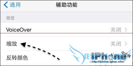 8、在辅助功能列表中,请在视觉栏目里找到“缩放”一栏,点击进入。