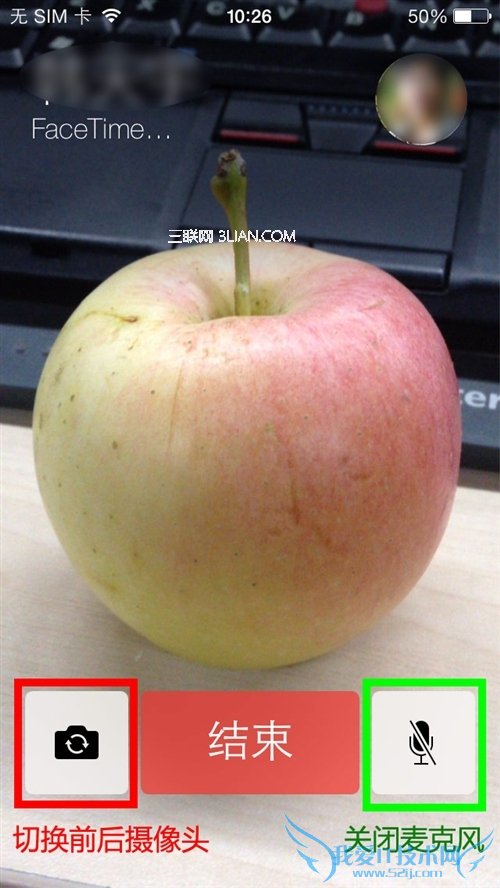 FaceTime连接中,点击左侧图标可以切换前后摄像头,右侧可以关闭和开启麦克风