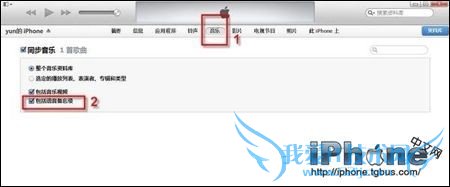 2、在电脑中打开iTunes工具,然后再在iTunes中点击顶部的“音乐” 选项,然后勾选上“同步音乐”和“包括语音备忘录” 之后再点击“应用”按钮开始同步资料,如下图所示。