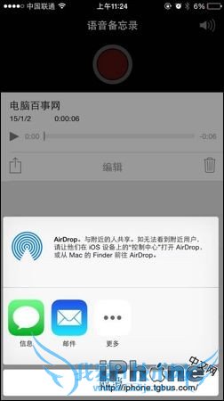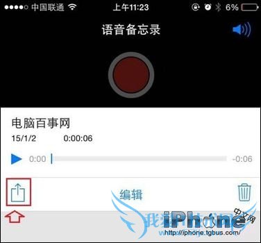 2、点击名为“电脑百事网”的iPhone6录音名称后,下方会弹出几个操作按键,我们点击第一个【分享】图标,如下图所示。