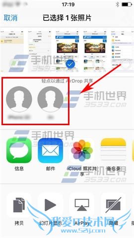 2)接下来我们进入相册选择一张照片,点击照片左下角【分享】按钮,再点击想要发送【头像】即可。(注:苹果手机的蓝牙功能不能跟其他手机配对)(如下图)