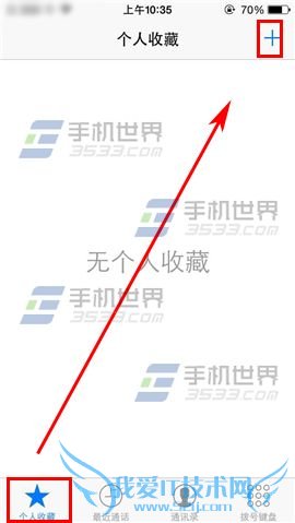 1)在通讯录界面点击【个人收藏】,再点选右上角【+】图标,在联系人界面选择一个【联系人】。(如下图)