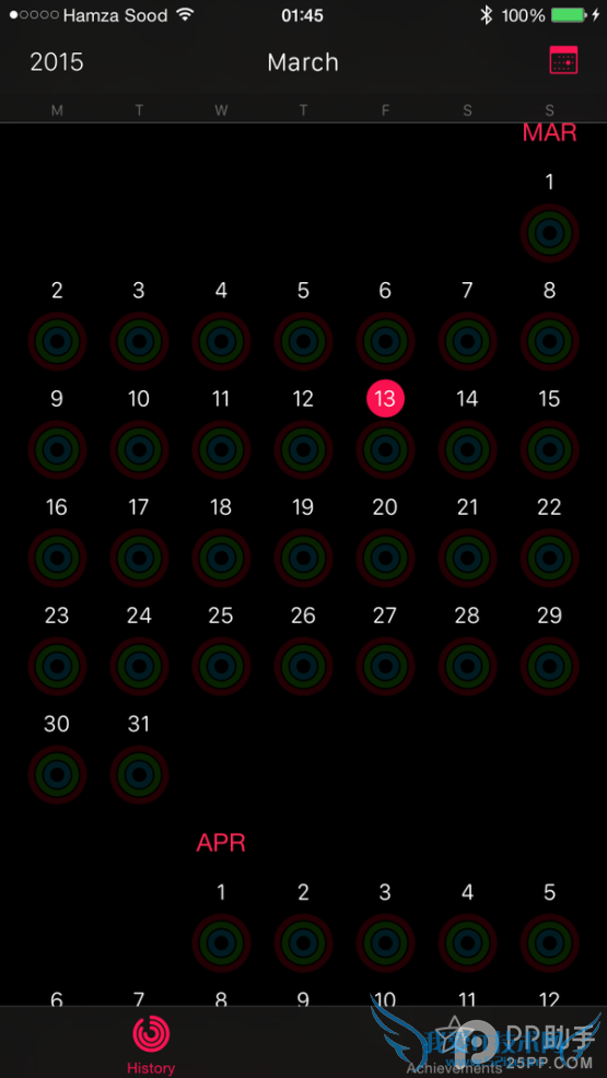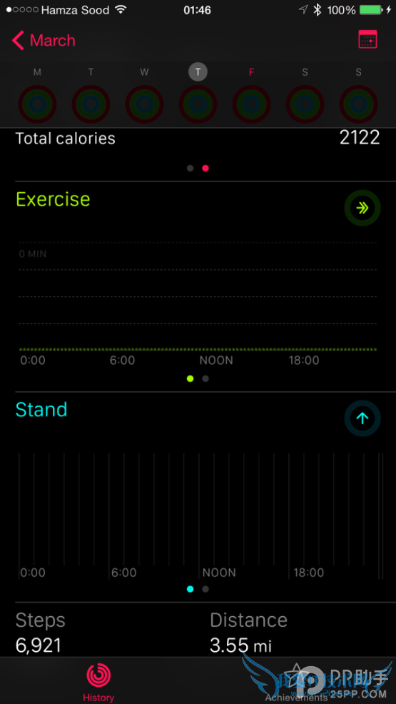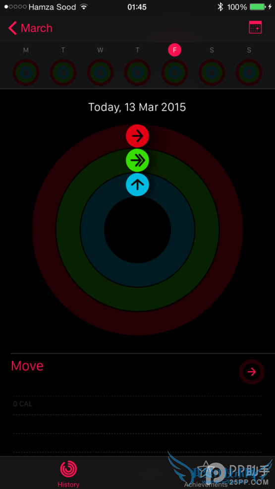 最后,它的界面也跟 Apple Watch 一样以黑色作为主调,来提前了解一下Activity app的界面。等到Apple Watch上市后,这将成为一款使用率非常频繁的应用。