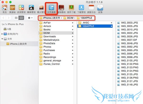 3.点击「文件管理」-「iPhone上的文件」-「DCIM」,选择 DCIM 这个文件夹中数值最大的文件夹。将前面准备好的 JPG 和 MOV 文件导入。(注意:也许你的 DCIM 文件夹中,还有 101、102、103APPLE 的文件夹,只要选择数值最大的那个文件夹即可。)