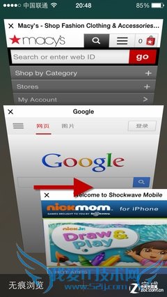 Safari浏览器的改进也是iOS7标志内容之一。手势操作主要分类两种,第一个是页面之间的切换,我们在浏览新的网页之后,可以从左至右、或是从右至左的滑动页面返回到前一个页面中,省去的是点击返回按钮的操作。另外,当我们调出卡片式网页内容时,左右滑动微缩网页也可以快速关闭页面。
