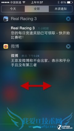 通知中心是苹果系统一贯的特色,它与Android系统中的下拉菜单有很大的不同。与以往的通知体系不同,iOS7中的通知中心可以查看当天、全部、错过的信息,具体包括了来电、短信、信息推送以及AppStore更新等等,这种分类方式还算直观。除了将手势向下拉动之外呼出通知中心外,在三个模块中也支持横向滑动操作。