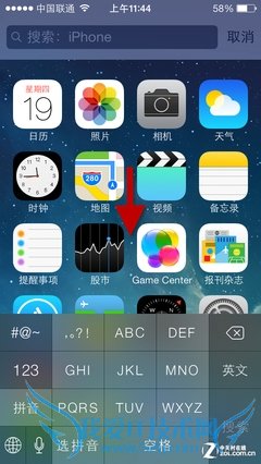 最后一项常用的操作功能是搜索功能的手势。以往在iOS6系统中,在主界面中向左滑动是可以进入单独的搜索界面。不过现在我们需要在主界面屏幕中间的位置向下滑动界面呼出Spotlight搜索栏,算是一个手势的改进吧。