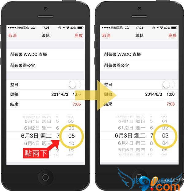 点选「+」开始新增行程事件,时间还可以直接调成整天,在调整时间的时候会发现时间都是 5 分鐘起跳,如果要设个 7:03 的行程,在时间转盘点两下