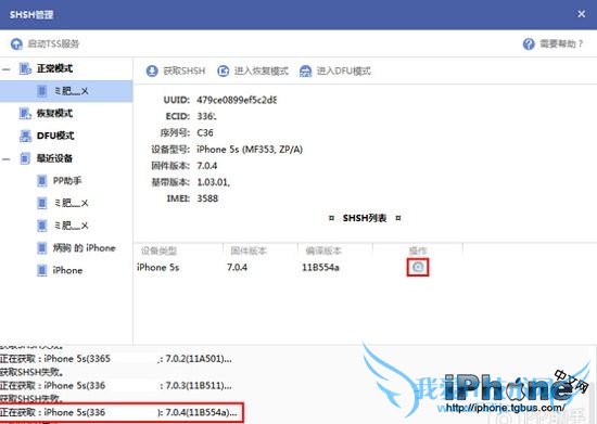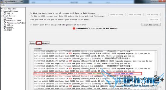点击【Log】显示绿色【SUCCESSFULLY】为成功备份SHSH的固件版本: