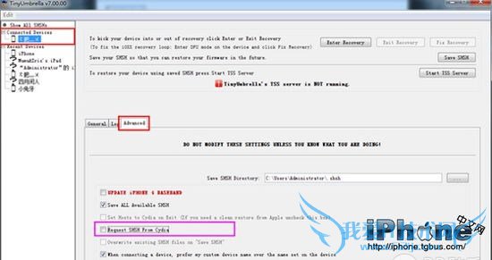 2.选择已经接设备名称 --点击【Advanced】-- 取消勾选【Request SHSH From Cydia】