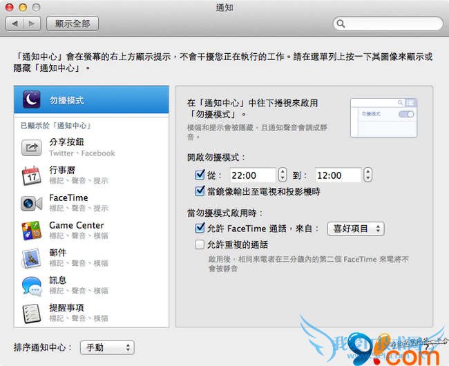 Mac 同样也有「勿扰模式」,主要是在阻挡「通知中心」的提醒以及联络人用 FaceTime 呼叫你。