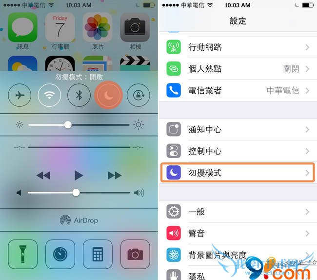 iOS 7 的控制中心自下方拉起后,可以直接开启「勿扰模式」,但我们今天要看更多「勿扰模式」的功能,请到「设定/设置」→「勿扰模式」。