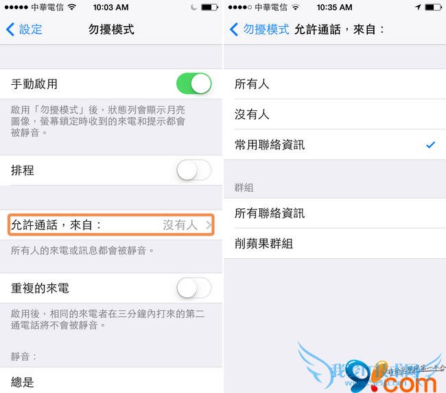 ▲ 接着回到「设定/设置」→「勿扰模式」,将「允许通话,来自:」勾选「常用联络资讯/个人收藏」。之后这些重要联络人即使在深夜勿扰开启时打给你都没问题啰!