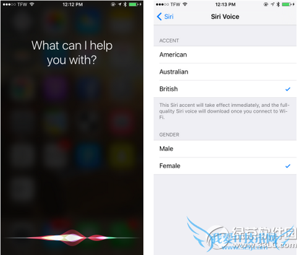 首先,Siri的用户界面发生改变,变得有些像Apple Watch的界面,在听你说话的时候,在屏幕底下有一条起伏线。在声音方面,Siri有6种不同的选择,分别是男女性别和英美澳三国的组合方式。绿茶网推荐女声加英式英语的组合,这样听起来会让Siri更加性感和智慧。