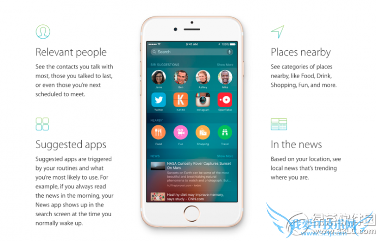 当你升级完iOS 9后,你将会看到新的搜索界面。这个界面不仅有搜索栏,还有你提前设置的常用联系人和应用,这会帮你会减少寻找的时间。此外,还有一些根据你所在的地址推荐一些APP和信息。当然,当你身处一个陌生环境的时候,这些推荐会有所帮助。不过,需要提醒的是,这些推荐信息并不是都靠谱,毕竟经过本地化后,有些东西就不像歪果仁体验的那般。在此也不传达歪果仁对此的赞美之词。