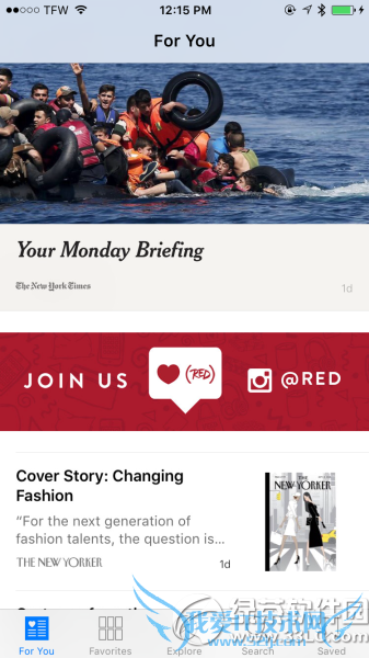 这是iPhone上的新闻APP,上图的For You是一个新闻定制栏目,这里所有的内容都是基于你的订阅和喜欢的新闻类型。