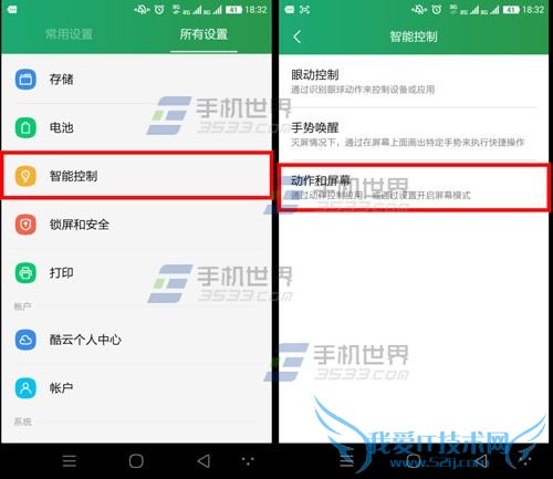 1)进入酷派大神F2【所有设置】界面,点击【智能控制】,点击【动作和屏幕】。(如下图)