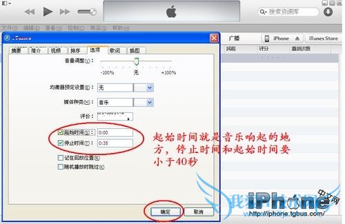 5、这样时间就可以设置了,大家可以找好听的音乐,记住想要截取的时间段输入进去,需要注意的是播放时间!要小于40秒哦,这里我们选择播放时间35秒为例。