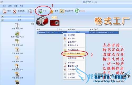 11、接着我们点击开始,等转换状态显示为完成,右键点击文件出现菜单,选择打开输出文件夹,现在我们铃声已经制作好了,找到它。