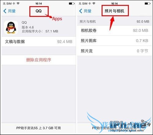 需要注意的是,[照片与相机]列表显示了相机胶卷、照片图库和照片流都占用了多少空间,但是,却不能单独删除。删除照片最快的方法是连接到iTunes,导入照片,然后删除。