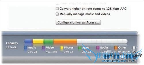 一般情况下,这里占用空间最大的一个类别是“其他”,但你知道在iTunes上显示的关于iPhone的彩色图形代表什么意思吗?其实这里包含了高速缓存、备份、部分下载文件还有一部分iOS 7内置应用程序的数据,比如短信和电子邮件。
