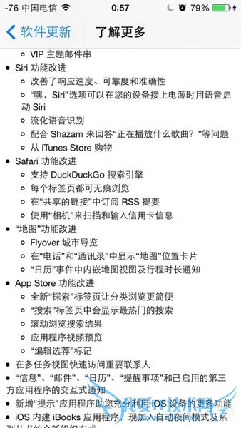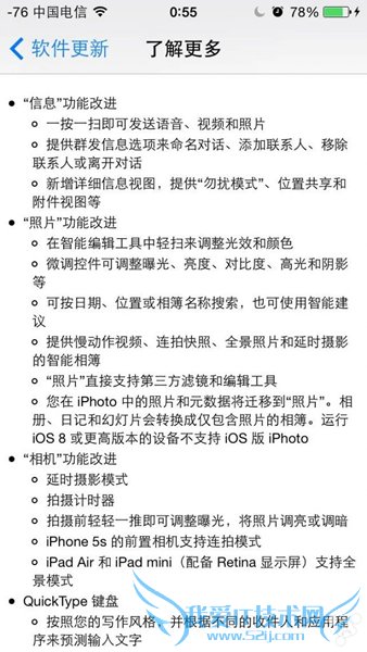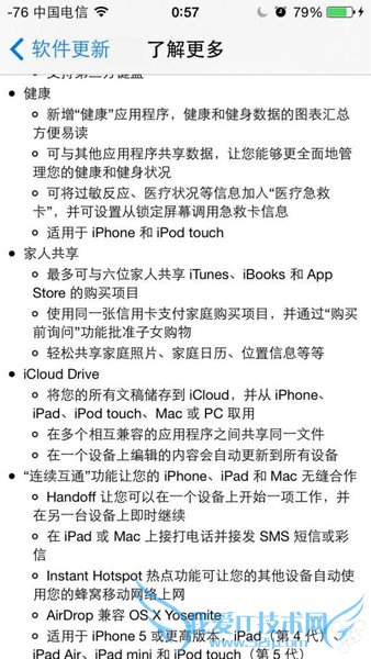 好了,这就是要和大家分享的iOS8正式版操作系统的体验。想升级的话,系统更新即可,越狱用户记得备份数据,后再升级哦。不过小编在此提醒大家升级有风险,如果已升级趁ios7在关闭验证之前赶紧降回来。