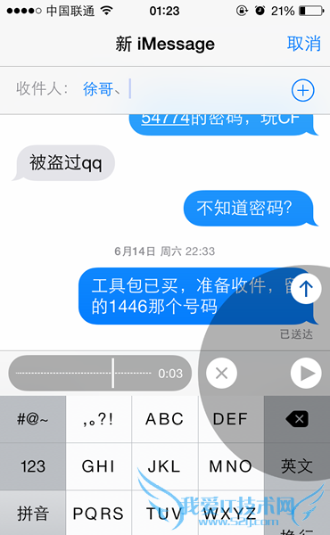 短信界面也没有太大的变化,但是如果对方开通iMesage后,可以通过iMessage发送语音信息了,感觉和微信很像。