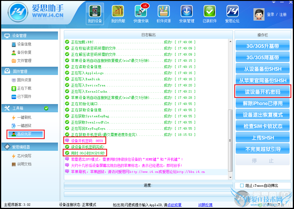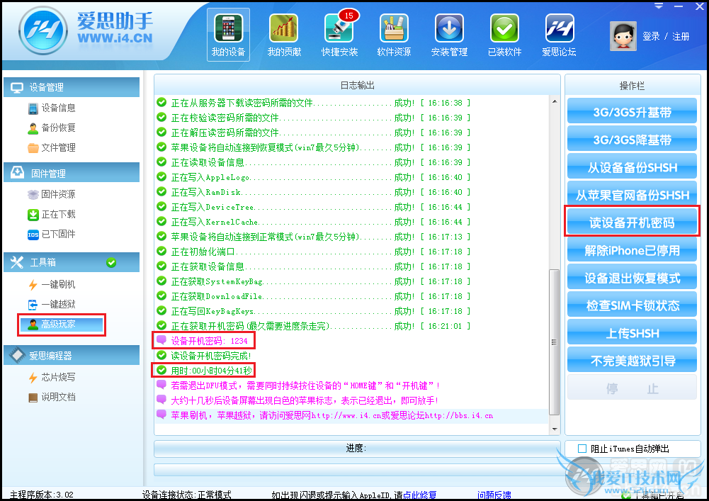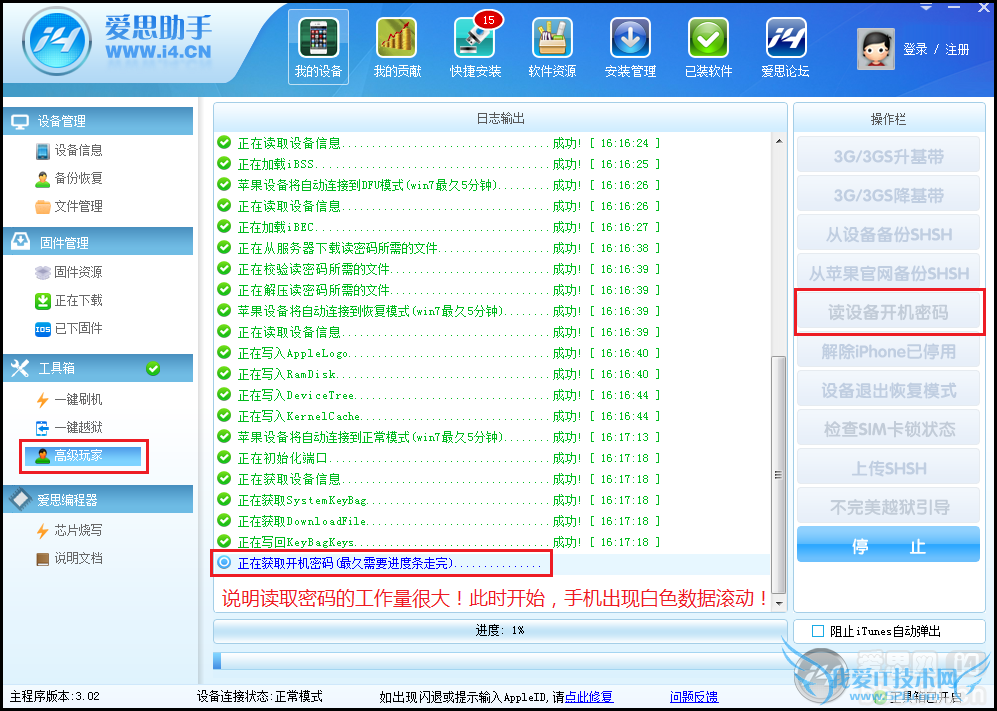 设备一旦进入到DFU模式,爱思助手立即开始“获取开机密码”!显示如下: