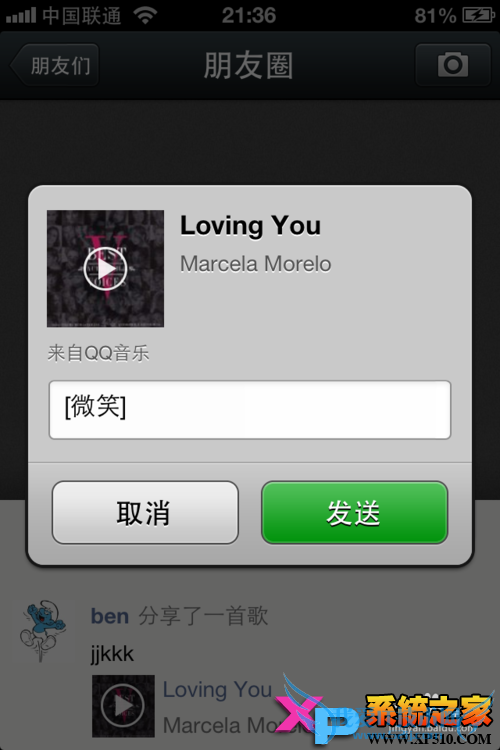 注:我在分享音乐的时候,必须输入文字或表情才可成功发送到微信朋友圈。